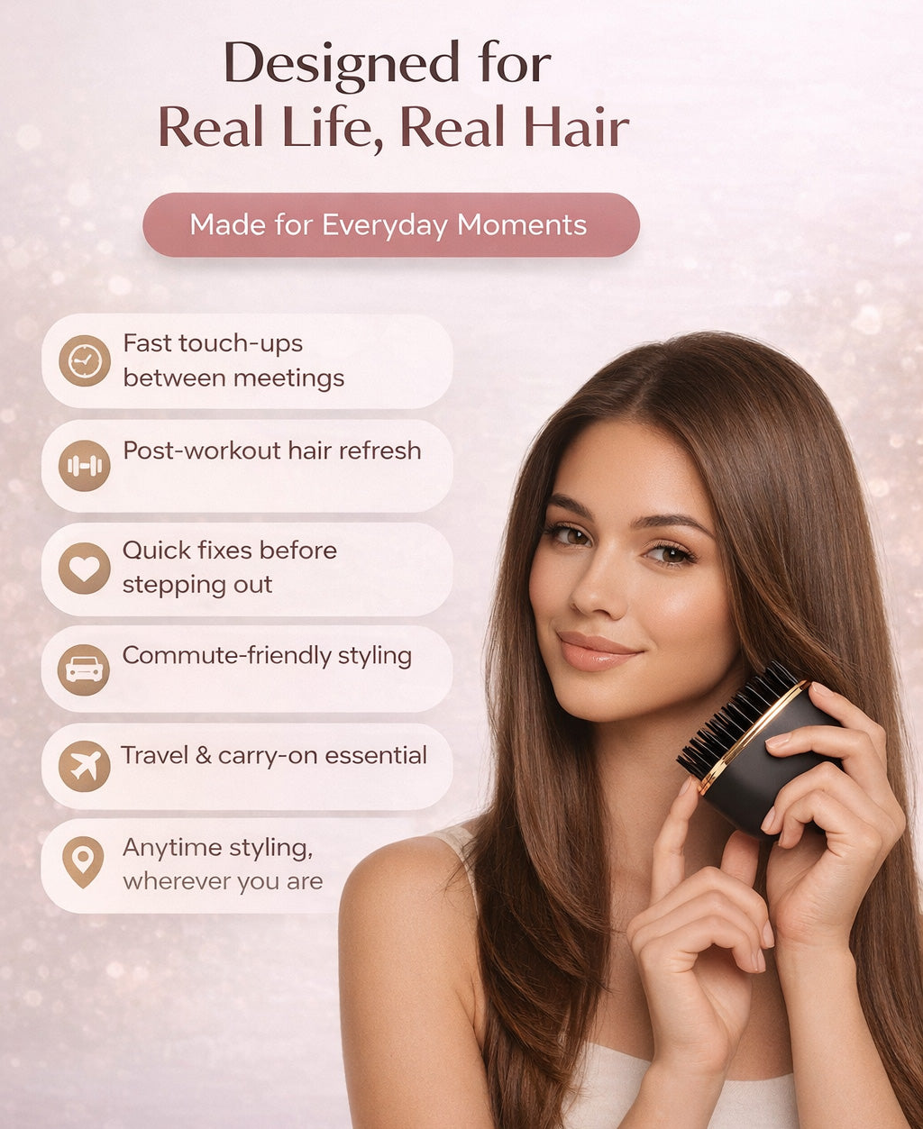 “I packed this for a trip and didn’t expect much, but it honestly saved my hair. After being out all day, my hair was frizzy and messy, and this smoothed it out so quickly. It’s lightweight, easy to use, and doesn’t make my hair feel flat. Such a game-changer for travel.”